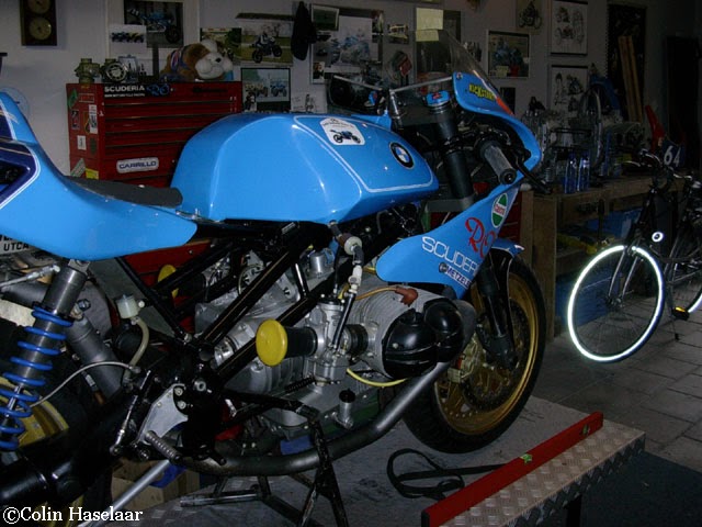 Early seventies Scuderia R.O. began with the conversion , making a special frame , tuning and other adjustments , including a special stronger telescopic fork and tune a BMW two -valve boxer engine OHV. The two valve has originally a displacement of 750 cc . Partly due to the underlying camshaft and shaft drive (all with power loss ) not usual choice . As a street bike , this boxer known as the Gummi Kuh .